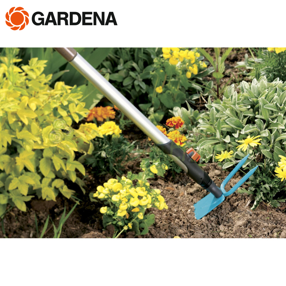 La zappa a punta bidente 3218-20 della serie combisystem di Gardena è particolarmente indicata per la cura del terreno senza danneggiare le piante in caso di colture e aiuole ravvicinate.