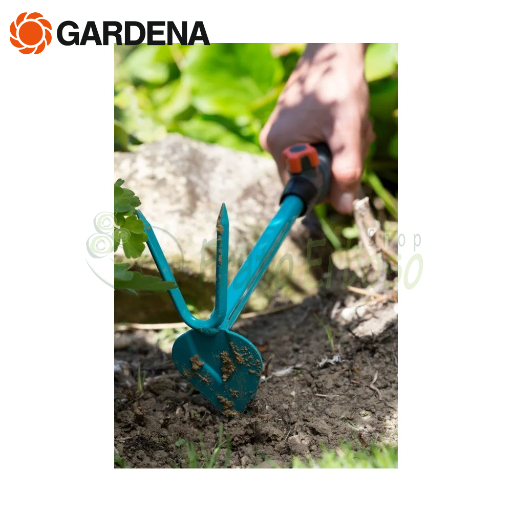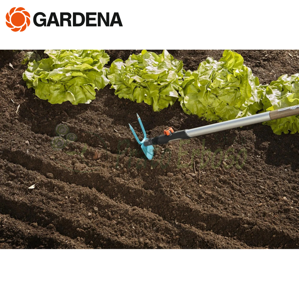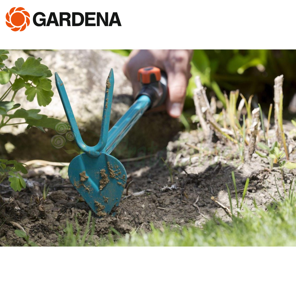 Die Gardena combisystem-Doppelzinkenhacke 3215-20 eignet sich besonders für die pflanzenlose Bodenpflege in dichten Kulturen und Blumenbeeten.
