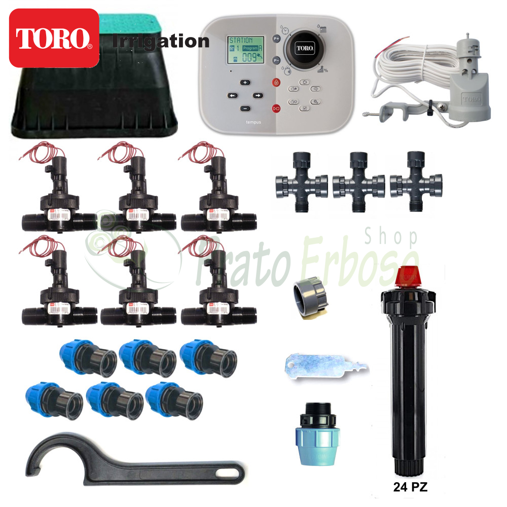 Das Set enthält alles, was Sie benötigen, außer den Regnern, um 6 Bewässerungssektoren mit Toro Irrigazione-Hauptkomponenten automatisch zu bewässern.