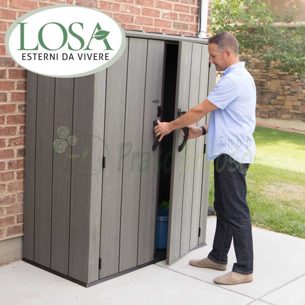 Elegant und platzsparend passt der Lifetime Kleiderschrank in kleine Räume und ist die ideale Lösung für die Aufbewahrung von Sportgeräten, Poolzubehör und anderen Gegenständen. Es besteht aus UV-geschütztem, doppelwandigem Polyethylen hoher Dichte und wird komplett mit Boden geliefert. 10 Jahre Garantie.