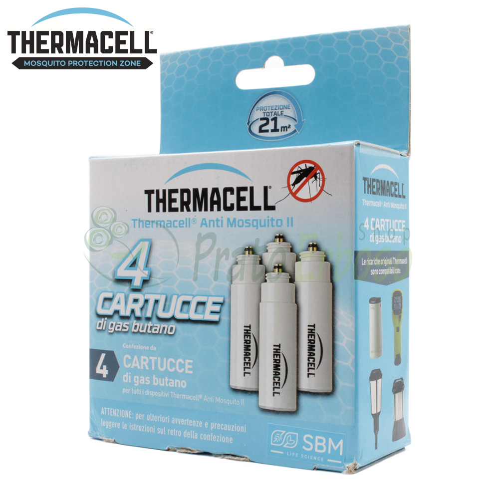 Das Paket enthält 4 Ersatz-Butankartuschen für 48 Stunden Schutz. Jede Kartusche hält 12 Stunden.