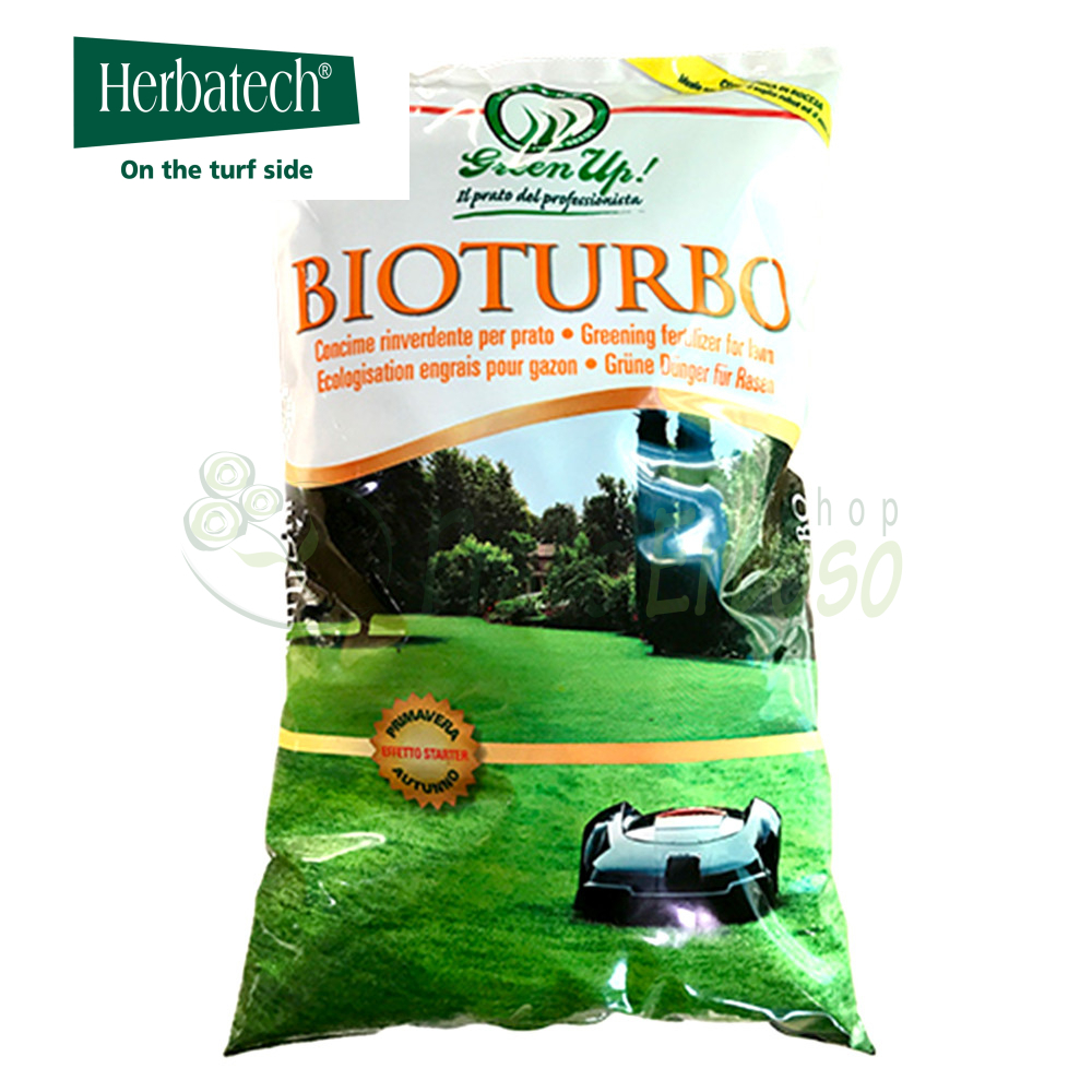 Der Bioturbo-Dünger aus der Green Up-Linie von Herbatech ist ein Gründünger für die Rasenpflege, ideal für Rasenflächen, die regelmäßig mit einem Mähroboter gemäht werden, und zum Mulchen, d. h. wenn der Grasschnitt auf dem Rasen verbleibt. Er sorgt ganzjährig für eine satte Farbe und einen gesunden Rasen.