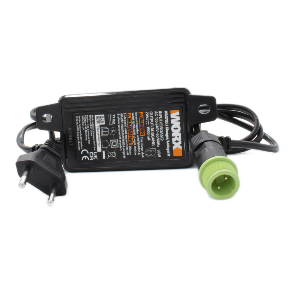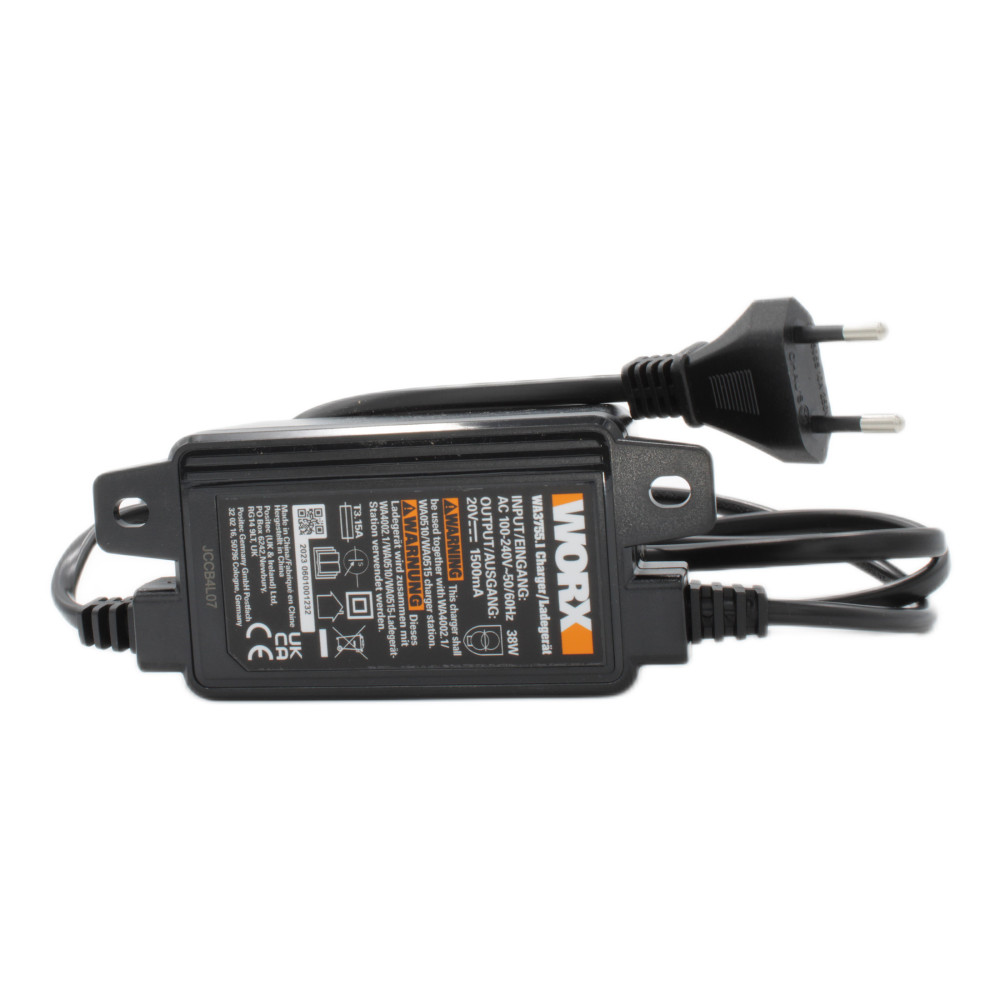 The Worx WA0466 kit includes a 50043732 charging base, a WA4002.1 charging tower, a WA3755 38-watt power supply with 110-220 volt input voltage and 20 volt output voltage, a 50035691 power cable and eight 50032396 fixing nails.
