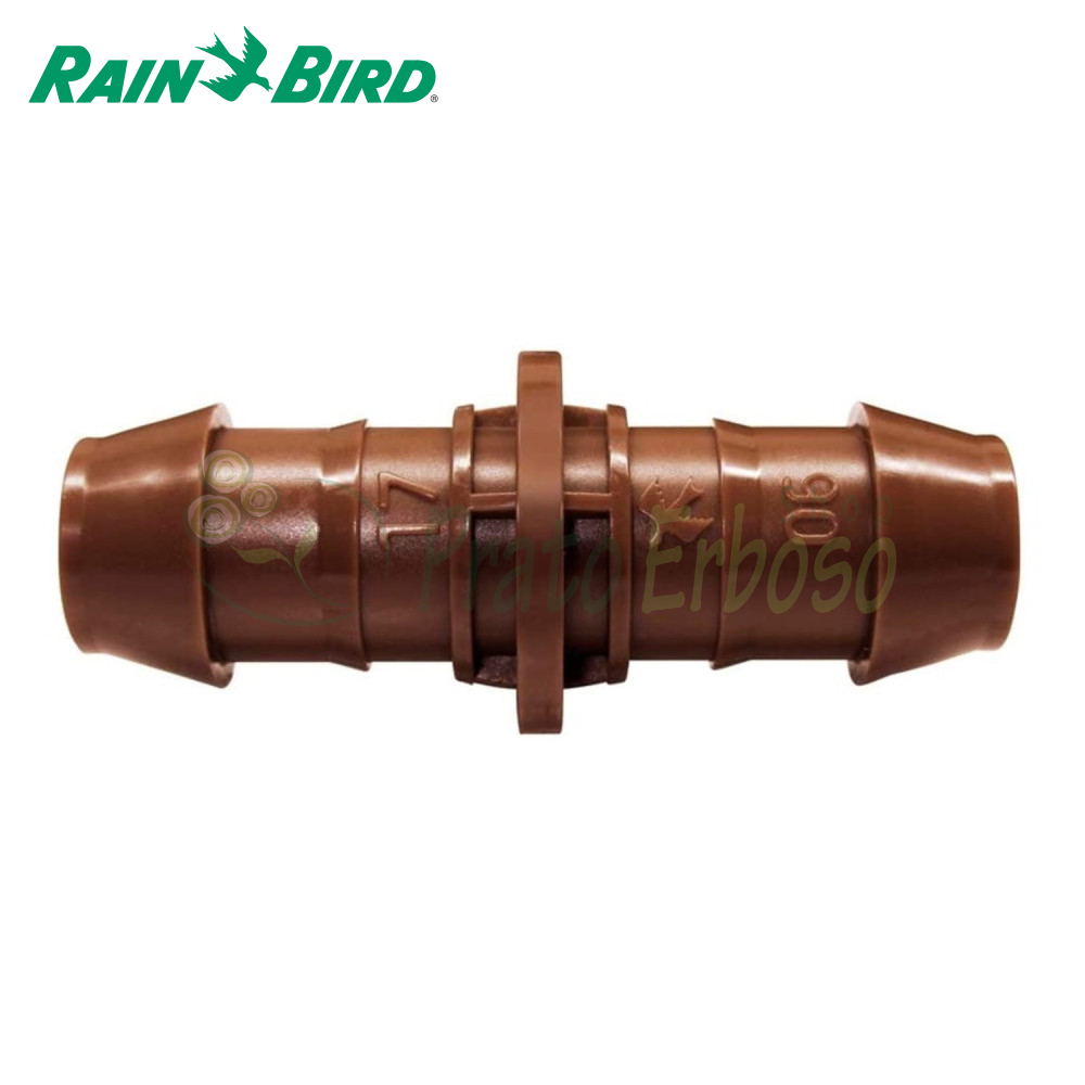 The Rain Bird XFF COUP hose fitting is made of brown acetal and is compatible with XF and XFS series driplines and most 17 mm OD polyethylene tubing.