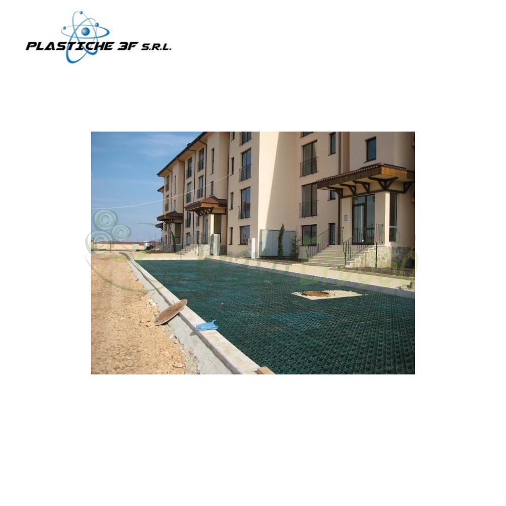 The GC 58V Driveway Grille by Plastiche 3F 4 cm thick, is a modular system made of HD PE, high density polyethylene, recycled and recyclable, and is resistant to atmospheric agents and acidic and basic chemical solutions.