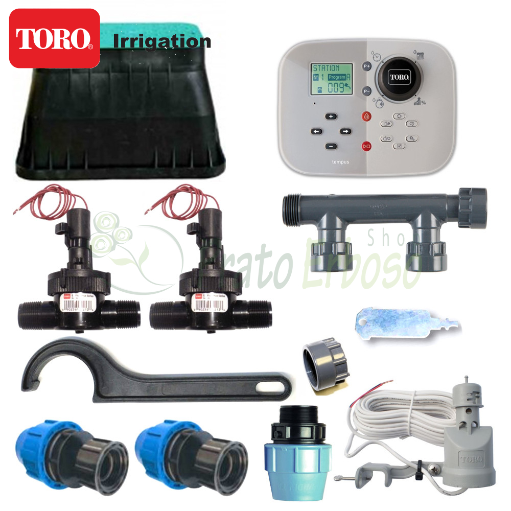 The kit contains everything you need, except the sprinklers, to automatically water 2 irrigation sectors with Toro Irrigazione primary components.