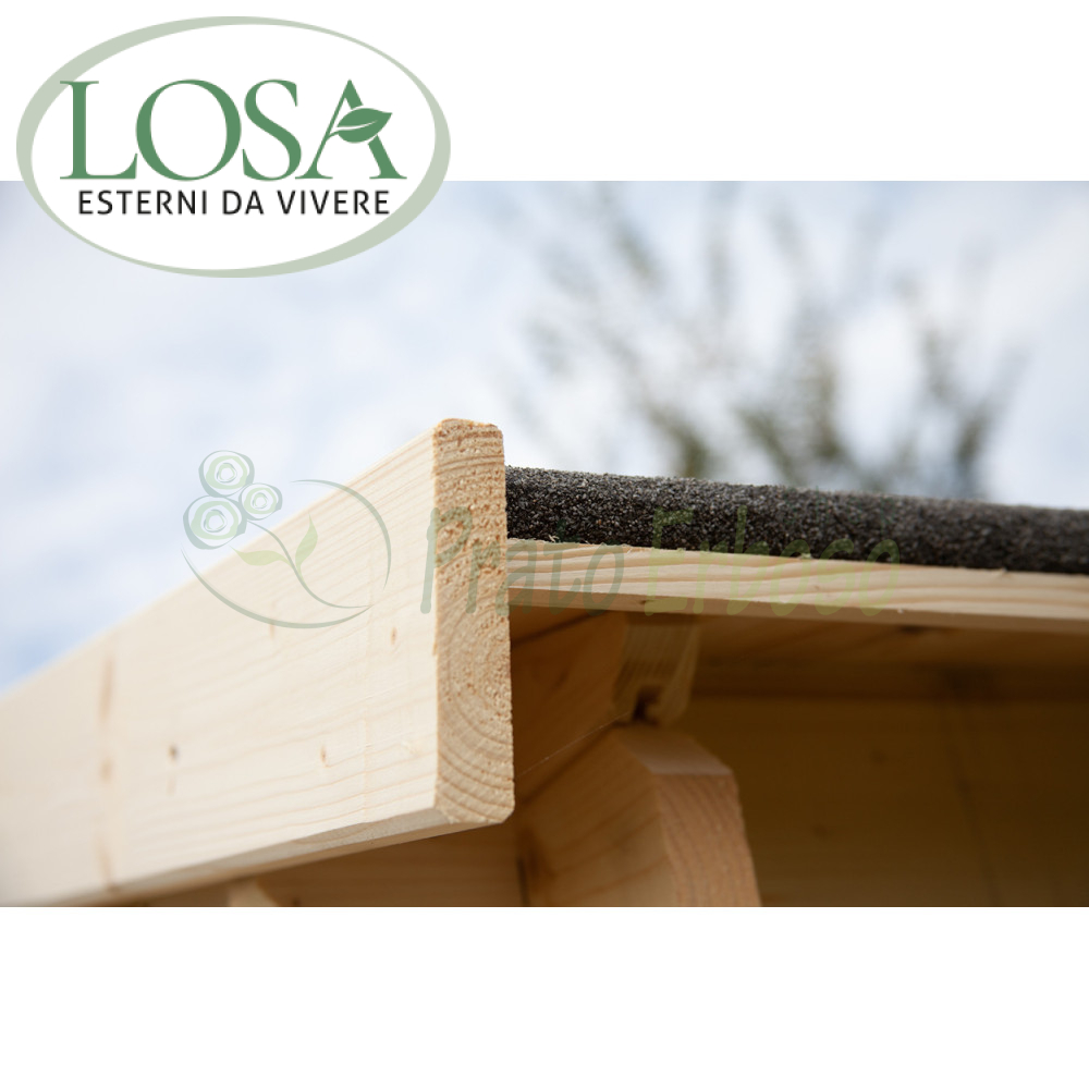 Seville is made of raw untreated fir wood. It is built with blockhouse typology. It has a double door with handle and lock. The wall thickness is 28mm. The roof is made with 16mm matchboarding and bituminous felt.