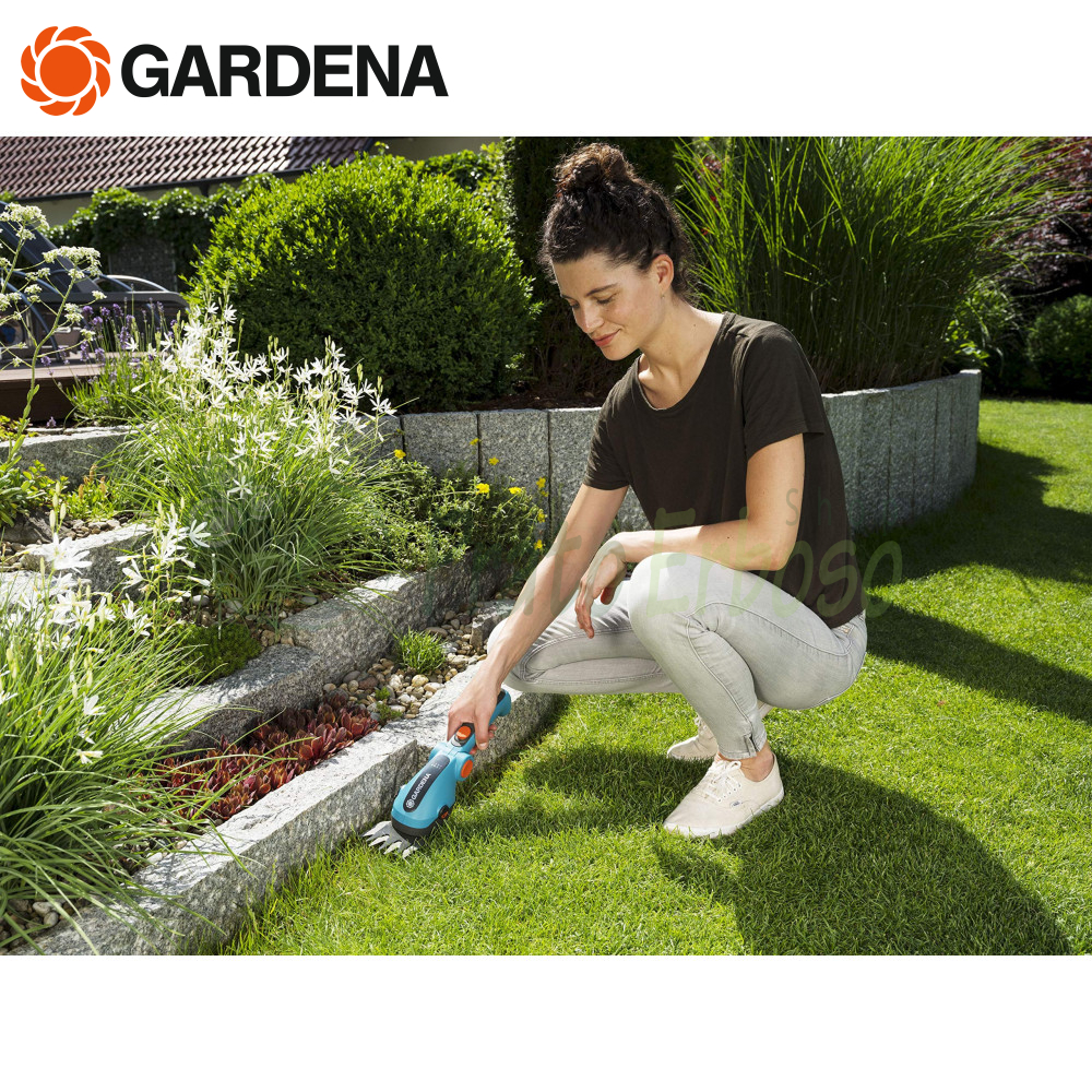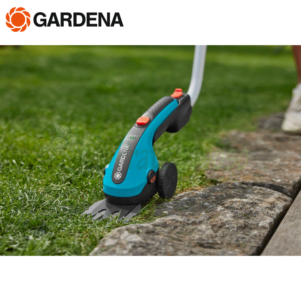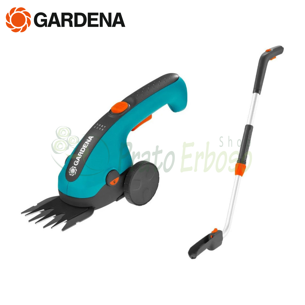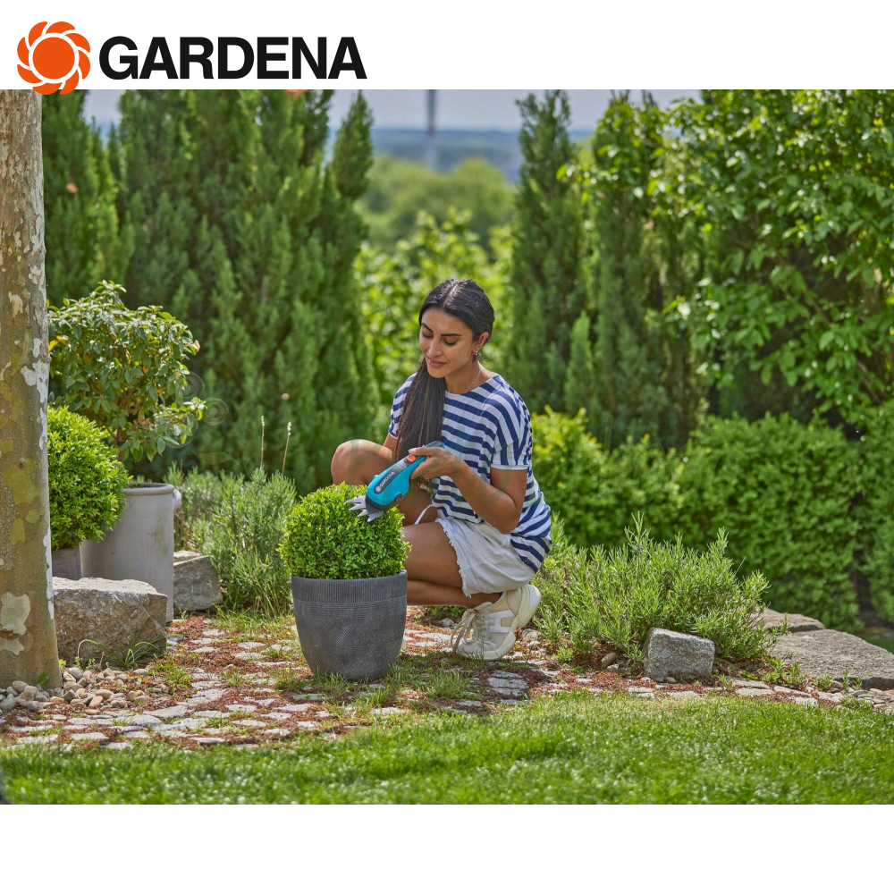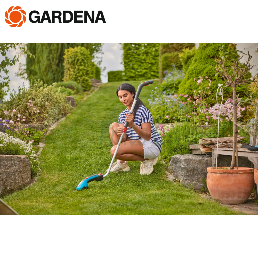 The ClassicCut Li + 9886-20 Cordless Grass Shears Set with handle and wheels from Gardena allows you to cut lawn edges in a practical and precise way.