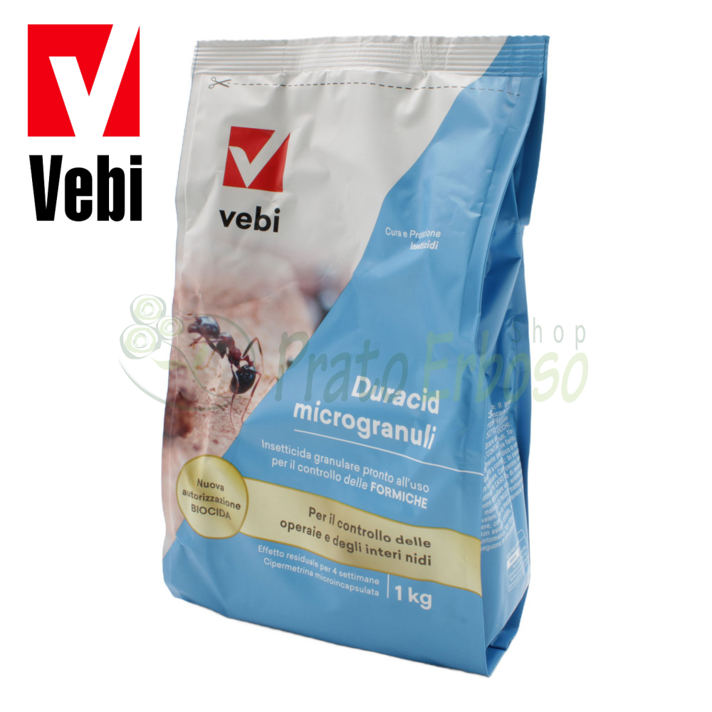 Vebi Duracid is a micro granular insecticide with a specific formulation against ants. The micro encapsulation of the active ingredient allows to increase the effectiveness of the product. The ant, after ingesting the bait, does not die instantly and has time to return to the colony, share the bait and trigger the domino effect that will lead to the complete destruction of the nest.