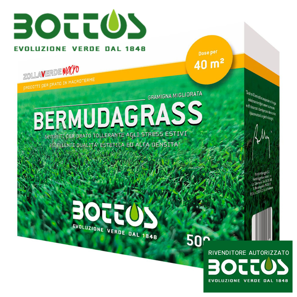 The Bermudagrass seeds from the Zollaverde Macro line by Bottos are a mixture of two different varieties of couch grass, for the creation of lawns for public and private areas and sports areas subject to trampling.