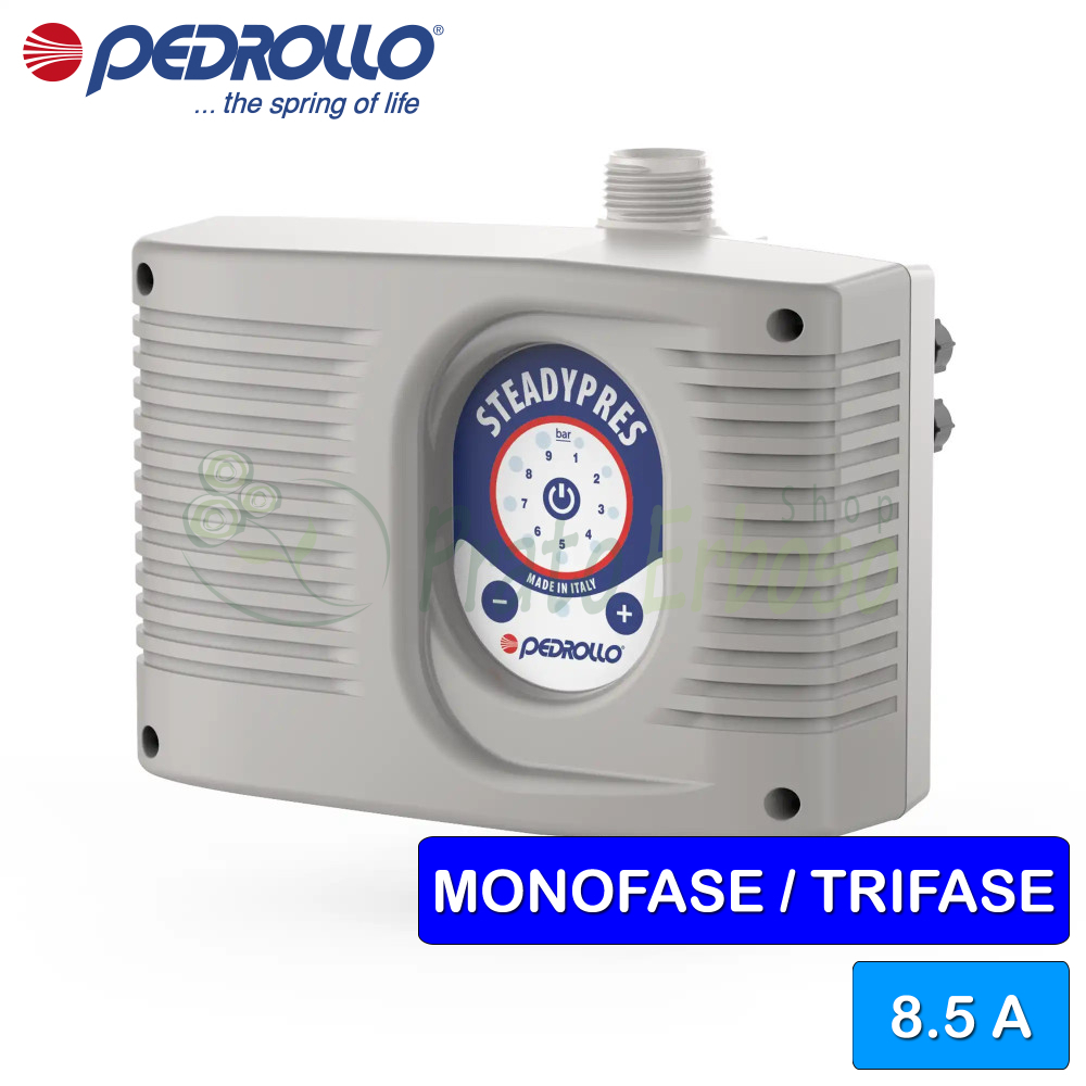 The STEADYPRES 4.0 by Pedrollo is an inverter for single-phase and three-phase 230 Volt surface and submersible electric pumps.