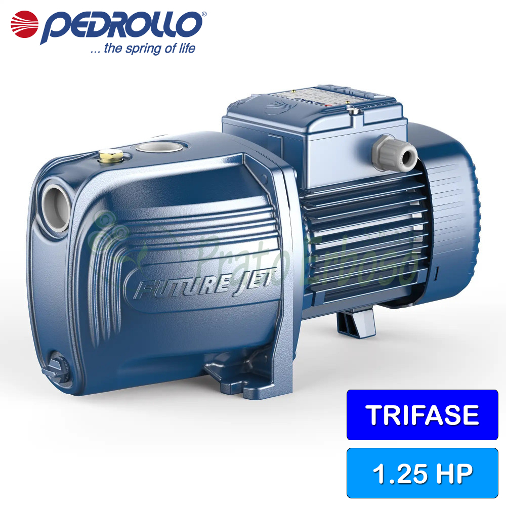 The FUTURE JET 2AH must be powered by a three-phase voltage, has a horsepower of 1.25 HP and the temperature of the liquid to be pumped ranges from -10 degrees centigrade up to +40.
