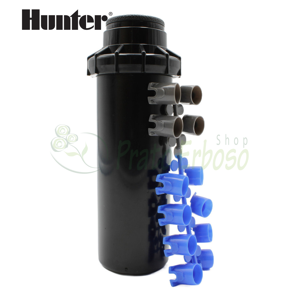 Es fácil de ajustar gracias a un tornillo de control de flujo con muescas que permite fijar el radio, ya sea con un destornillador común o con una llave Hunter específica. Es robusto y confiable. Tiene un cuerpo de plástico duradero y una tapa de goma que protege contra daños causados por impurezas.