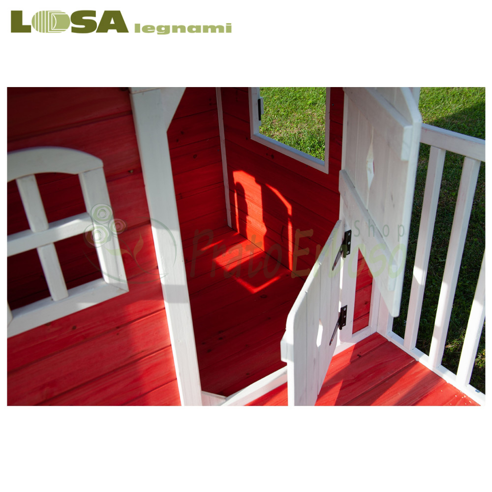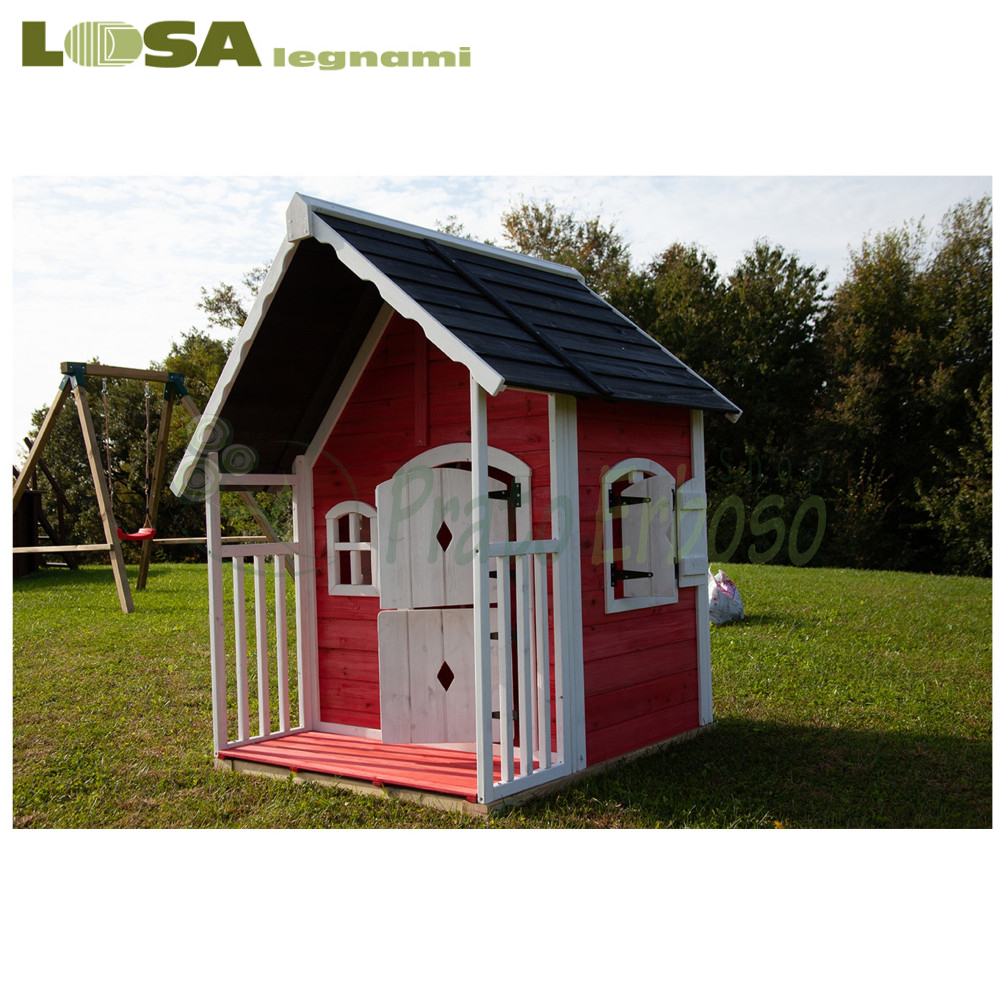 Anny es una casa de abeto impregnada en rojo realizada con una tipología de construcción de paneles, ideal como juego para niños.