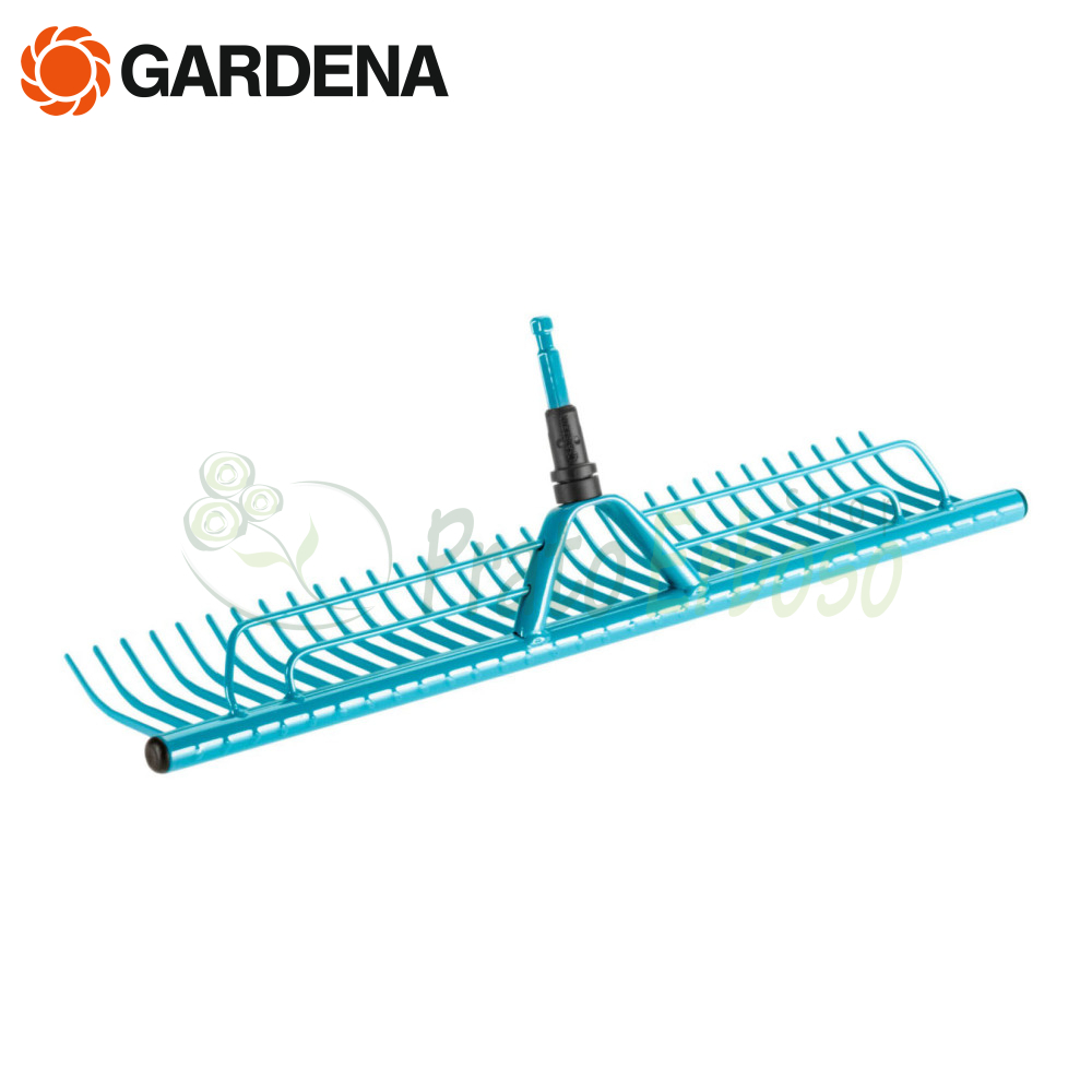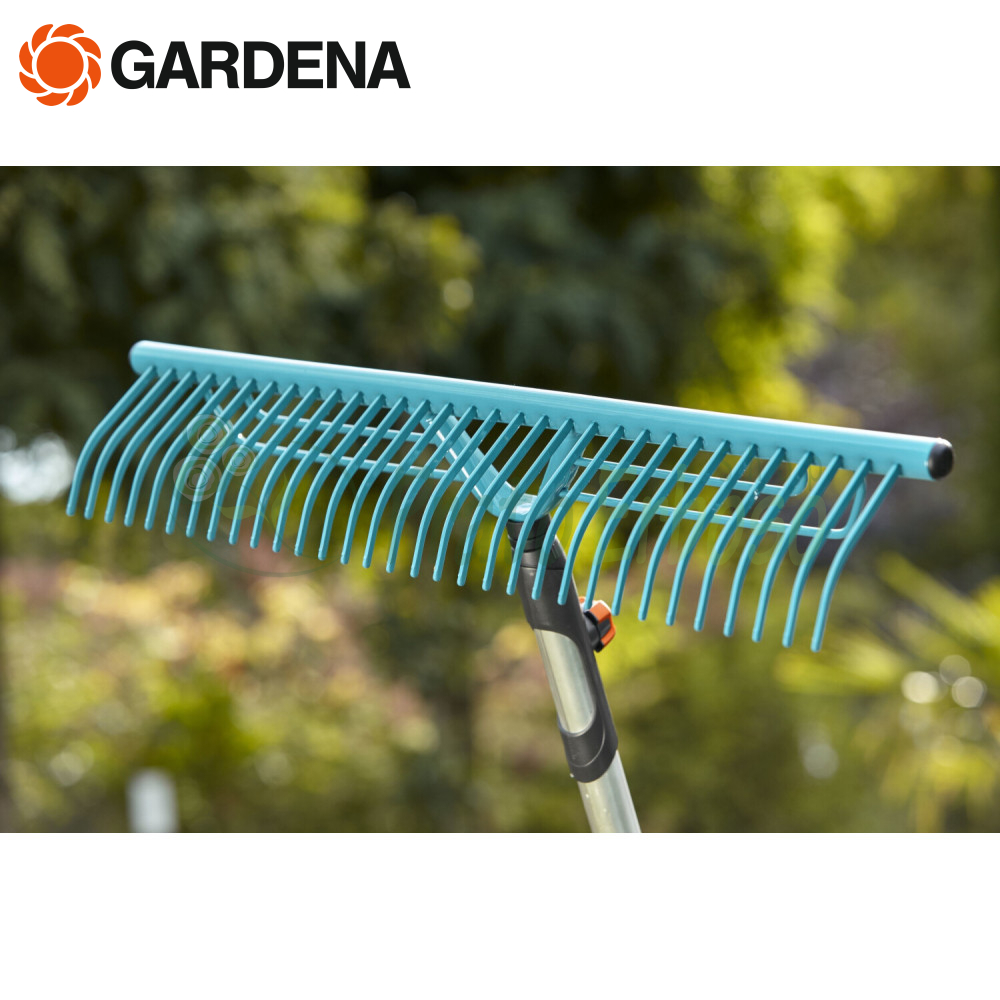 El rastrillo para césped 3381-20 de la serie combisystem Gardena es útil para limpiar perfectamente el césped de restos de hierba y hojas.