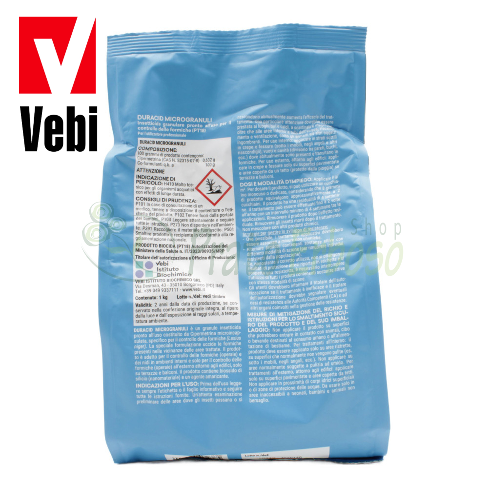 Vebi Duracid es un insecticida micro granulado con formulación específica contra hormigas. La microencapsulación del principio activo permite aumentar la eficacia del producto. La hormiga, tras ingerir el cebo, no muere instantáneamente y tiene tiempo de regresar a la colonia, compartir el cebo y desencadenar el efecto dominó que conducirá a la destrucción completa del nido.