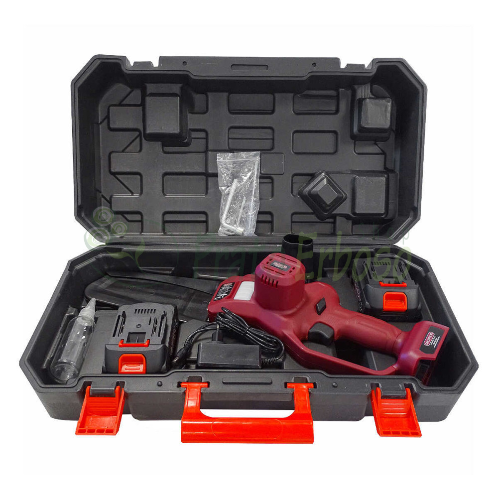 Se suministra con 2 baterías de 21 voltios, con una duración de 2 horas cada una, y cargador de batería.