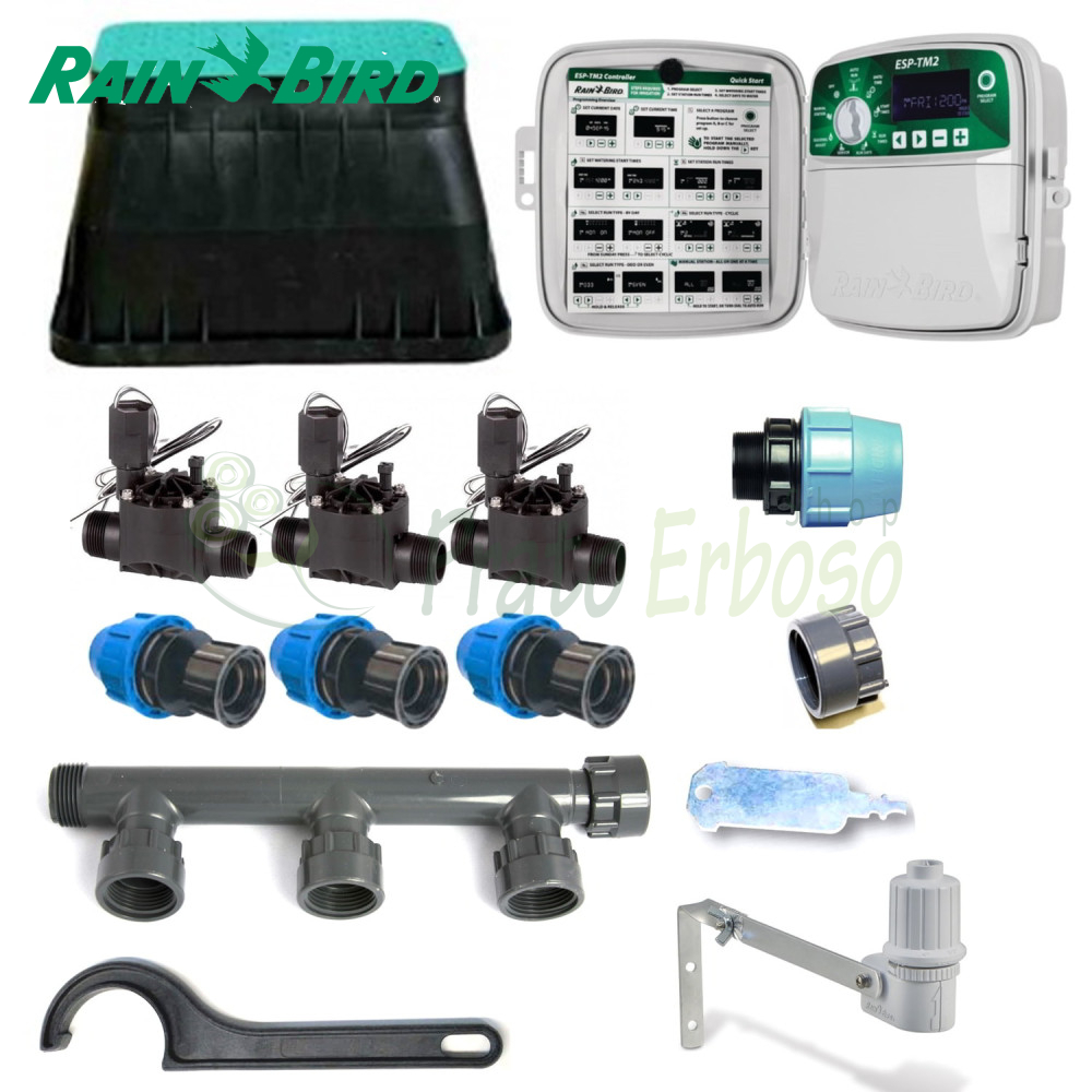 El kit contiene todo lo necesario, excepto aspersores, para regar automáticamente 3 zonas de riego con componentes primarios Rain Bird .