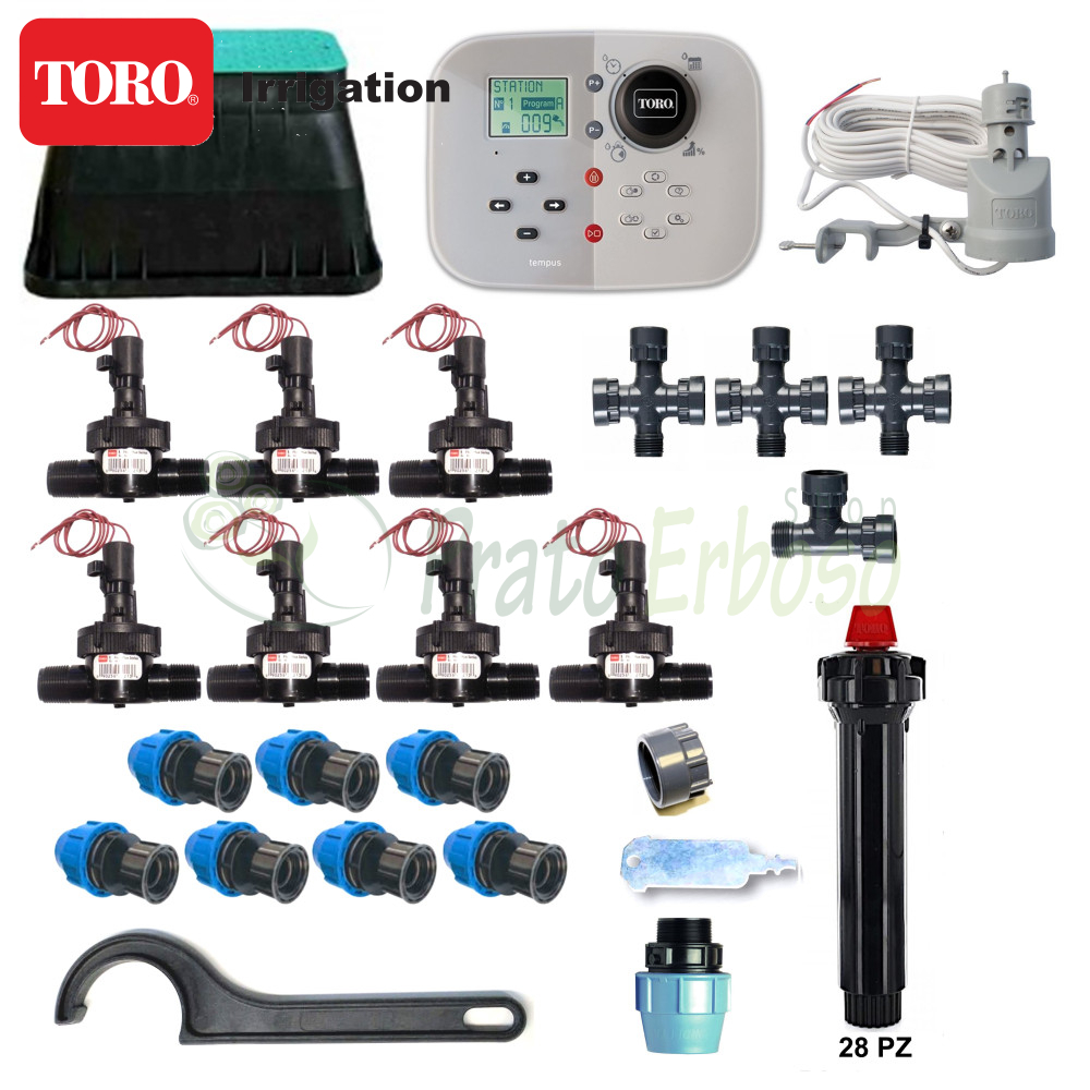 El kit contiene todo lo necesario, excepto los aspersores, para regar automáticamente 7 sectores de riego con componentes primarios Toro Irrigazione.