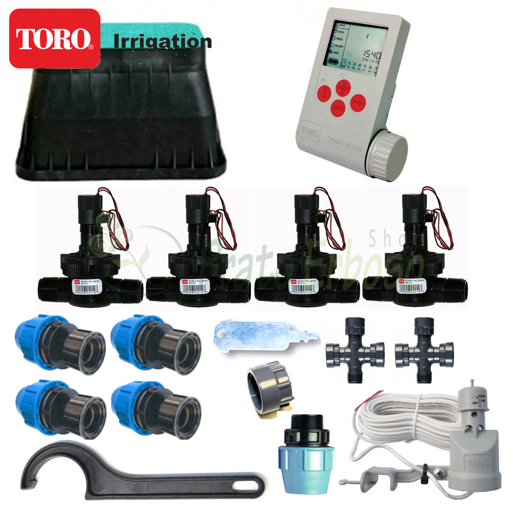 Le kit contient tout ce dont vous avez besoin, à l'exception des arroseurs, pour arroser automatiquement 4 secteurs d'irrigation avec les composants primaires Toro Irrigazione.