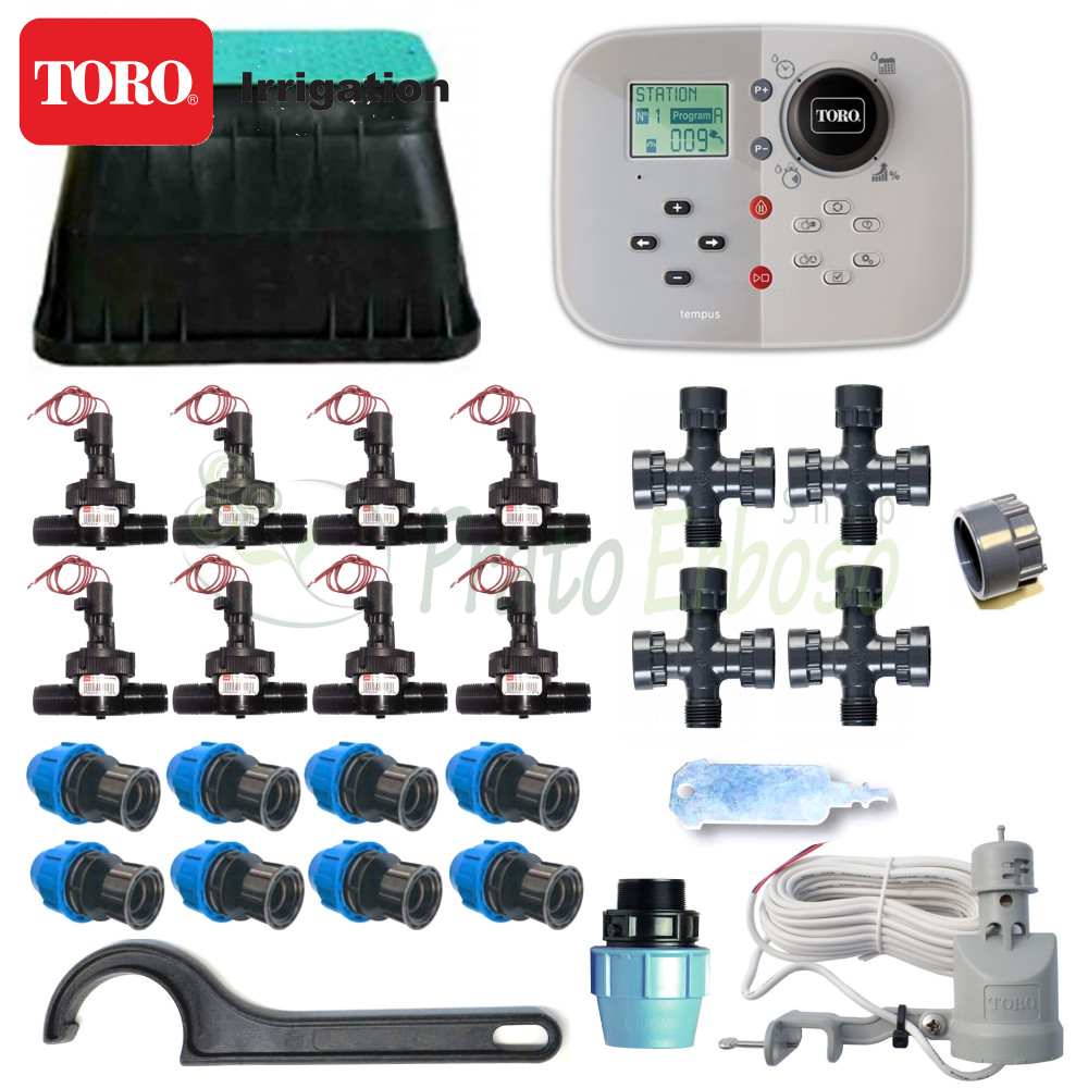 Le kit contient tout ce dont vous avez besoin, à l'exception des arroseurs, pour arroser automatiquement 8 secteurs d'irrigation avec les composants primaires Toro Irrigazione.