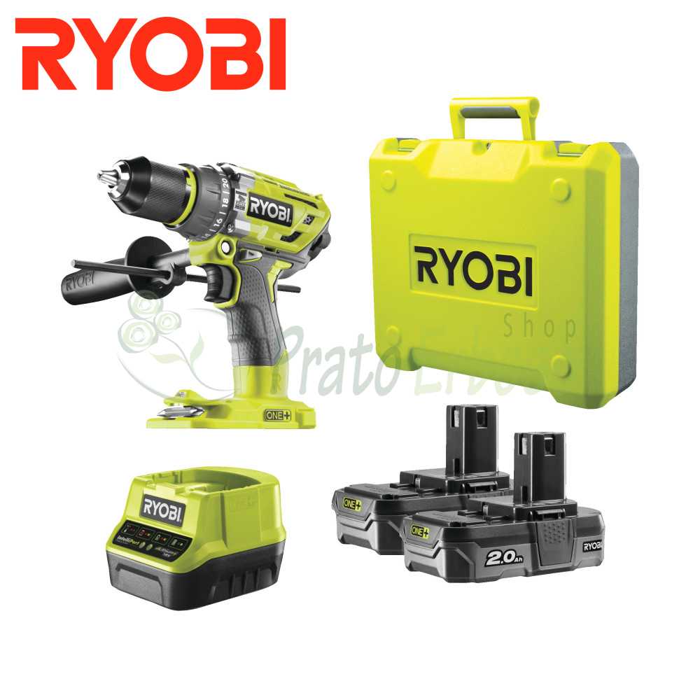 Le pack R18PD7-220B se compose d'une perceuse Ryobi R18PD7-0, de 2 batteries de 2 ampères, d'un chargeur et d'une mallette de transport.