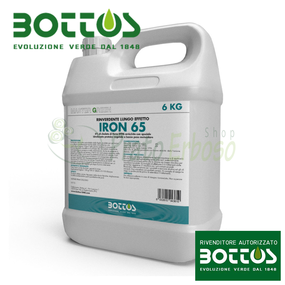 IRON 65 de Bottos est une formule à base de fer chélaté 6% DTPA avec une haute assimilabilité foliaire et un large spectre de stabilité au pH de l'eau de 4 à 9.