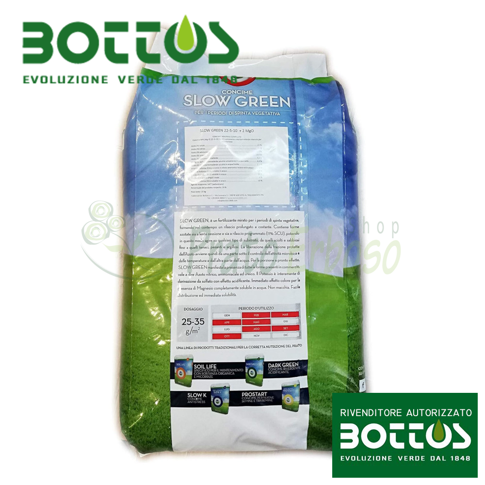 L'engrais Slow Green de la gamme Zolla Verde de Bottos est défini comme un engrais minéral composé NPK avec un titre 22-5-10, contenant de l'azote à libération contrôlée sous forme organique synthétique.