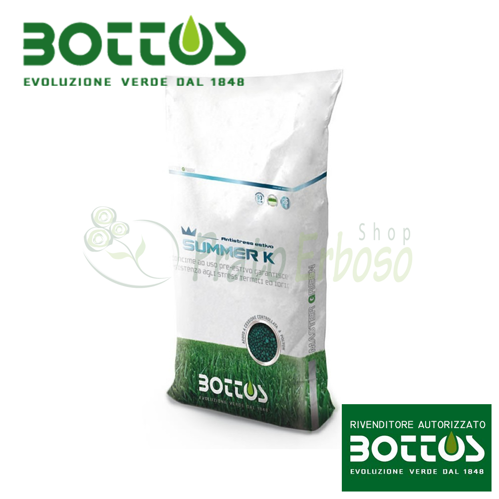 Le nouvel engrais pour pelouse d'été Summer K 10-0-30 de Bottos se caractérise par une fraction azotée entièrement à libération programmée et une fraction potassique entièrement issue du sel de sulfate. Le Potassium (K) a des fonctions anti-stress estivales, grâce à son action fortifiante sur les tissus végétaux, conférant à la végétation une plus grande tolérance aux principaux stress estivaux.