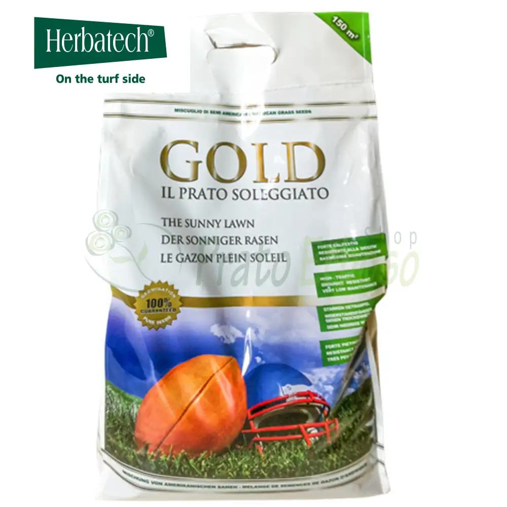 Les graines Gold de la ligne Green Up d' Herbatech sont le mélange de fétuque arundinacée, d'ray-grass anglais et d'herbe des prairies, d'origine américaine, pour la création d'un gazon d'aspect esthétique agréable mais, en même temps, de rusticité, de résistance et de rapidité. établissement.