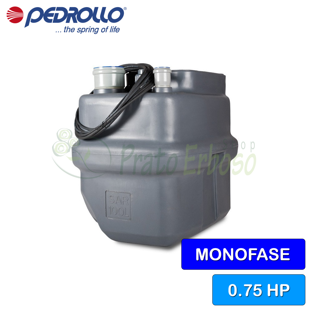 Réservoir de 100 litres. Pompe Pedrollo RXm 3. Débit de refoulement jusqu'à 220 l/min (13,2 m³/h). Hauteur de refoulement jusqu'à 11,5 m. Moteur de 0,55 kW (0,75 CV).