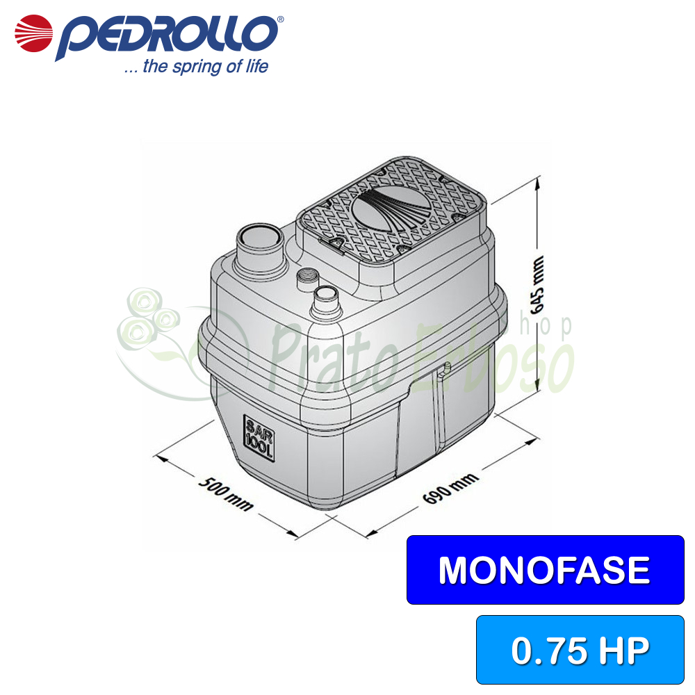 Réservoir de 100 litres. Pompe Pedrollo TOP 3-VORTEX. Débit de refoulement jusqu'à 180 l/min (10,8 m³/h). Hauteur de refoulement jusqu'à 8 m. Moteur de 0,55 kW (0,75 CV).