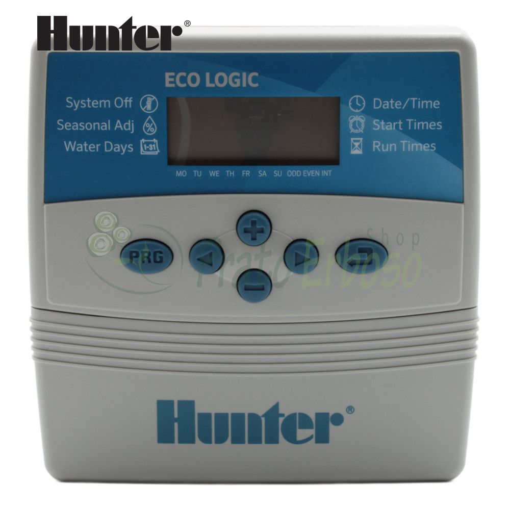 Le contrôleur Hunter Eco Logic est doté de fonctionnalités sophistiquées telles que la programmation à un bouton, Hunter Quick Check, deux programmes indépendants avec quatre heures de démarrage chacun, un calendrier de 365 jours pour l'arrosage des jours pairs ou impairs, un réglage saisonnier de 10 % à 150 %, la compatibilité avec les capteurs météorologiques et la mémoire permanente.