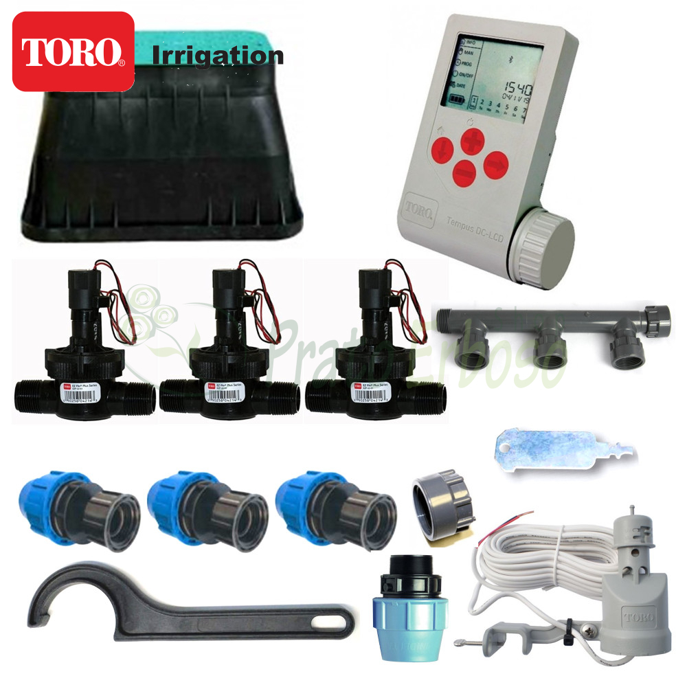 Il kit contiene tutto il necessario, a parte gli irrigatori, per irrigare automaticamente 3 settori di irrigazione con componentistica primaria Toro Irrigazione.