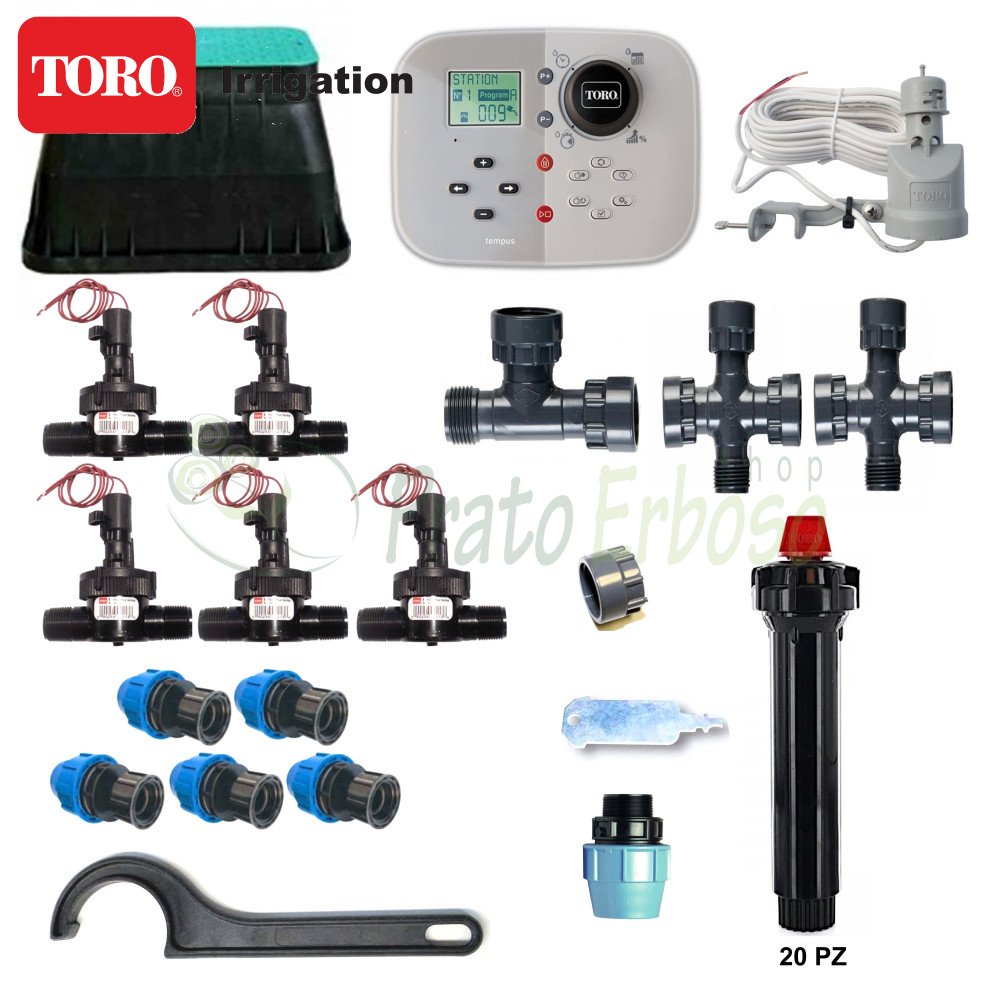 Il kit contiene tutto il necessario, a parte gli irrigatori, per irrigare automaticamente 5 settori di irrigazione con componentistica primaria Toro Irrigazione.