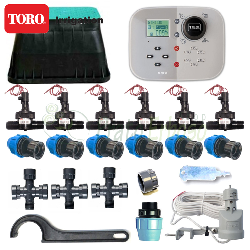 Il kit contiene tutto il necessario, a parte gli irrigatori, per irrigare automaticamente 6 settori di irrigazione con componentistica primaria Toro Irrigazione.