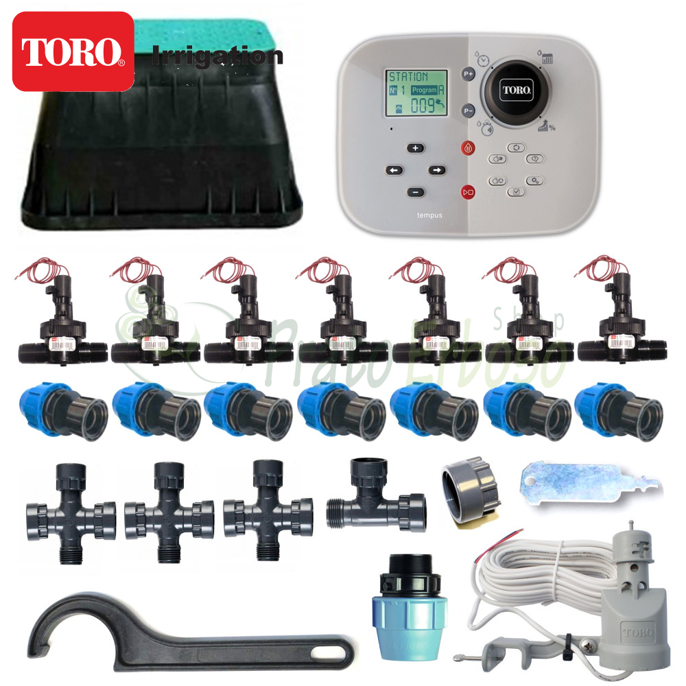Il kit contiene tutto il necessario, a parte gli irrigatori, per irrigare automaticamente 7 settori di irrigazione con componentistica primaria Toro Irrigazione.