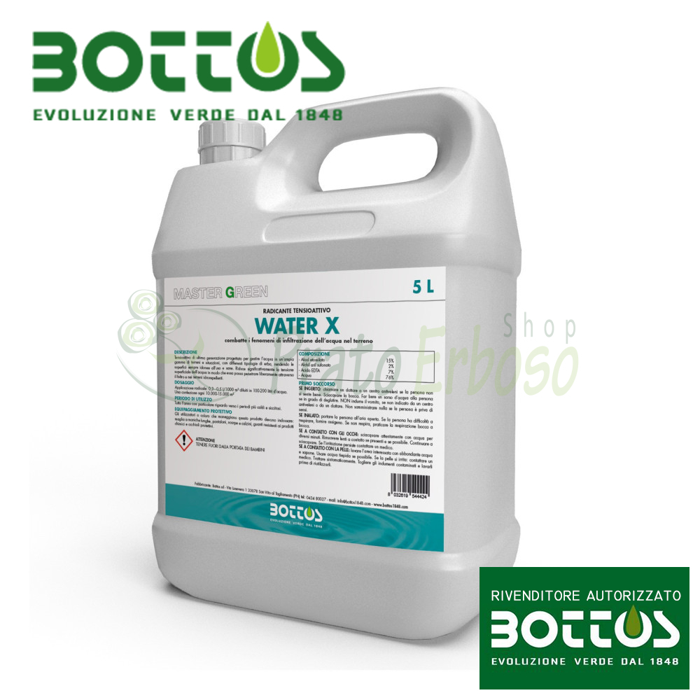 Composizione, periodo di utilizzo e dosaggio consigliato del tensioattivo per prato Water X della Bottos.