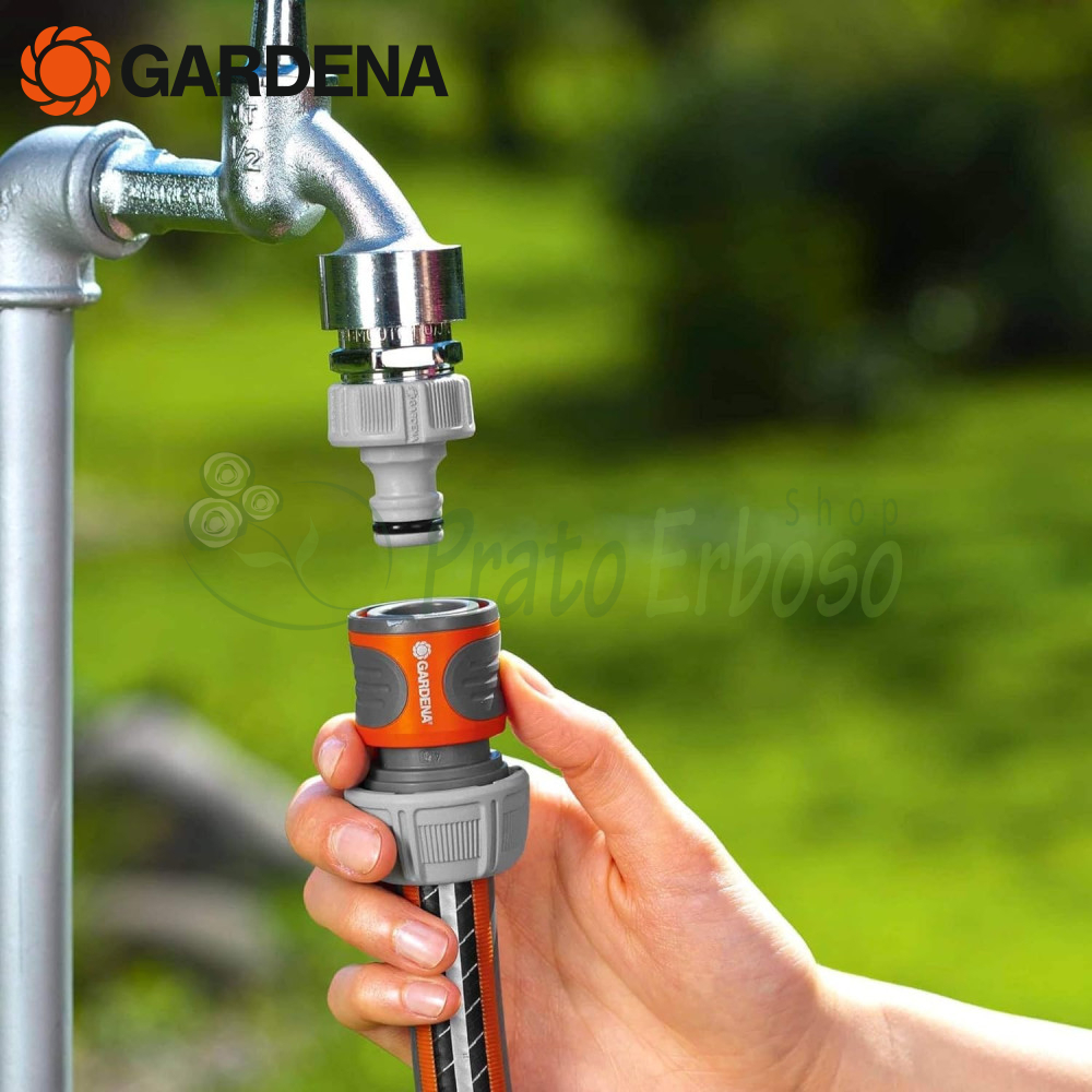 Il raccordo rapido 18216-20 di Gardena permette di effettuare un collegamento facile e comodo all'estremità del tubo.