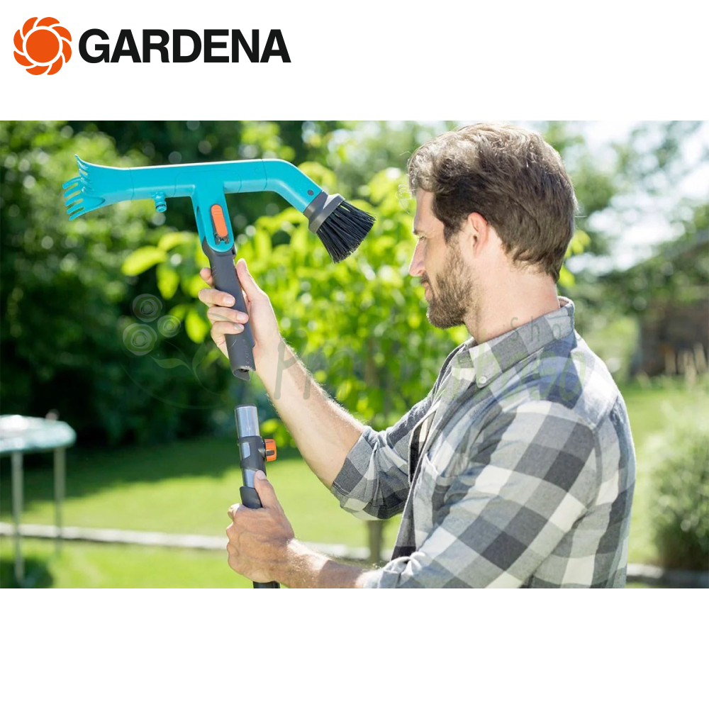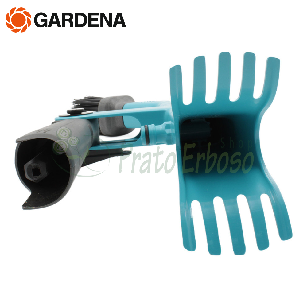 De asemenea, puteți folosi un jet de apă pentru curățarea jgheabului. Acest lucru este posibil printr-o conexiune integrată Original Gardena System, pentru conectarea simplă a furtunului de grădină.