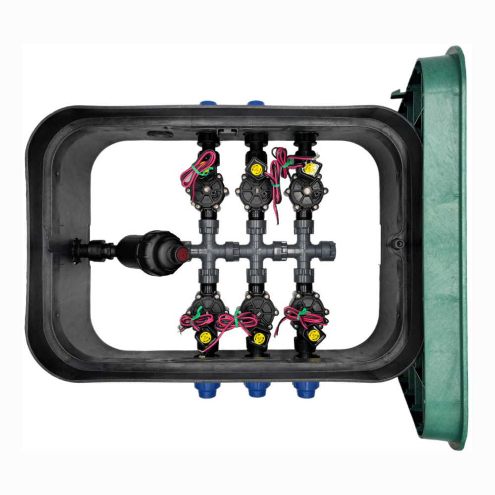 Colectorul robust din PVC lipit, rezistent la presiune de până la 10 bari, electrovalvele înșurubate la colector prin racordul de racord care permite demontarea rapidă și alegerea diferitelor combinații, fac din carter să fie singurul din categorie.