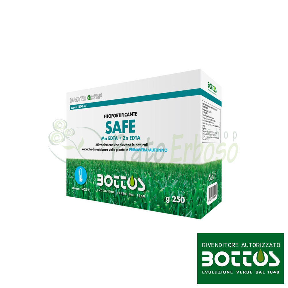 Safe di Bottos è una soluzione di concime studiato per sopperire alle carenze di Manganese e Zinco del prato. I due elementi partecipano all’importante fenomeno d’induzione di resistenza del tappeto erboso: le piante imparano a difendersi da sole dalle malattie fungine e dalle difficoltà ambientali.