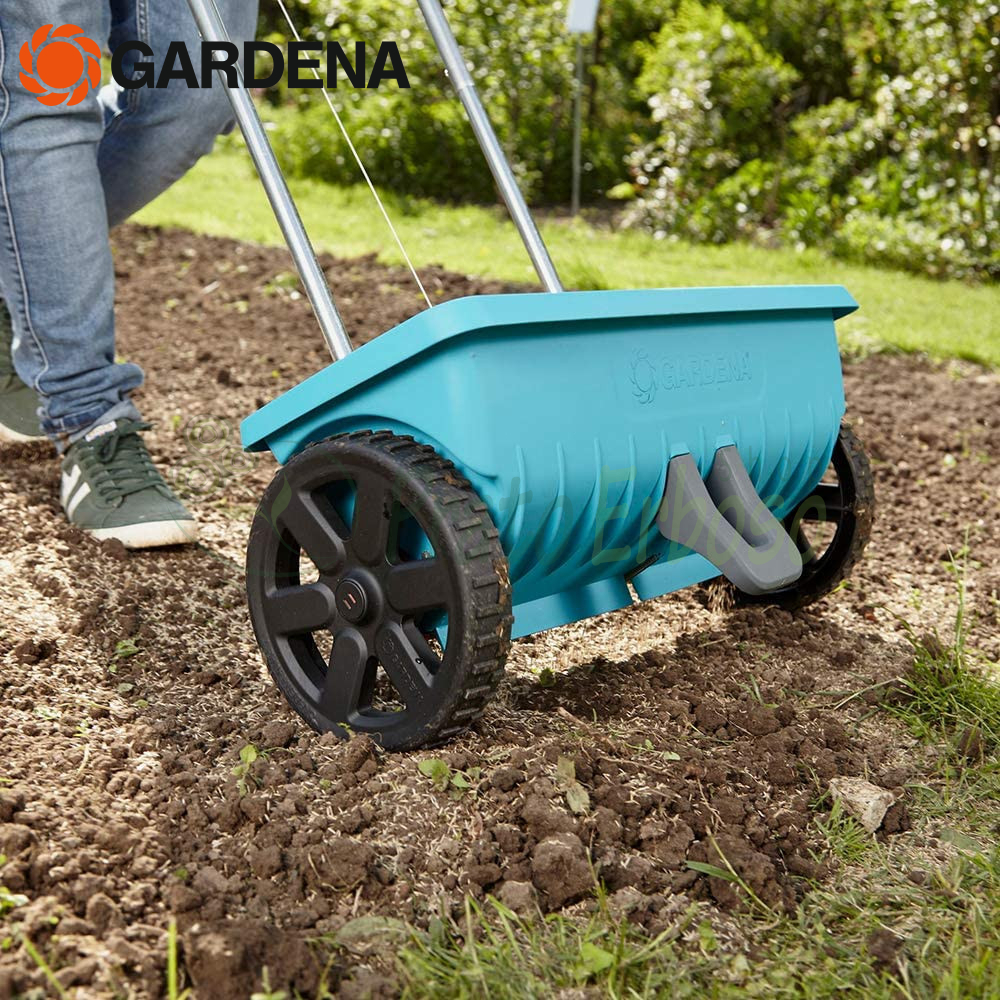 Distribuitorul de îngrășăminte Gardena L 432-20 este ideal pentru distribuirea comodă a îngrășămintelor și a sării de drum pe suprafețe de dimensiuni medii.