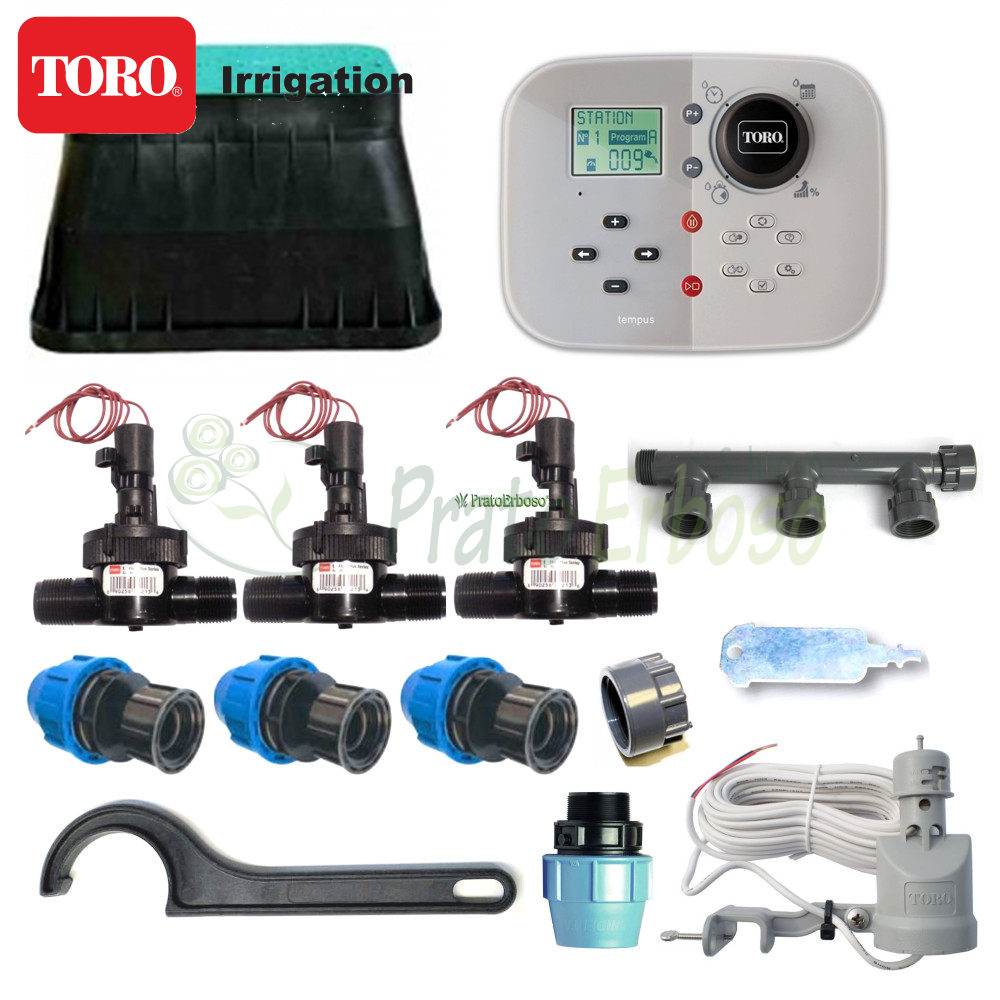 Kitul conține tot ce aveți nevoie, cu excepția aspersoarelor, pentru a uda automat 3 sectoare de irigații cu componente principale Toro Irrigazione.