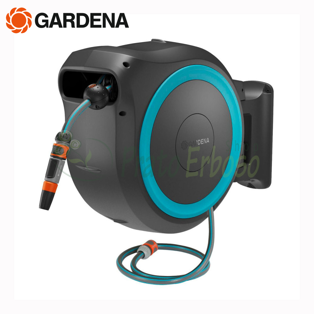 Tamburul de furtun RollUp M/L 18620-20 este echipat cu protectie antifurt si vine cu toate accesoriile necesare: suport de perete, un furtun de conectare, toate Piesele de asamblare si Sistemul Original Gardena si o lance de pulverizare cu doua optiuni de pulverizare diferite.