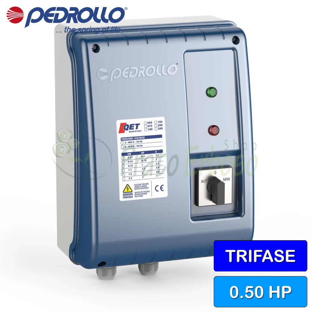 Tabloul electric QET 050 din seria QET de la Pedrollo este compatibil cu pompele electrice submersibile cu motoare trifazate.