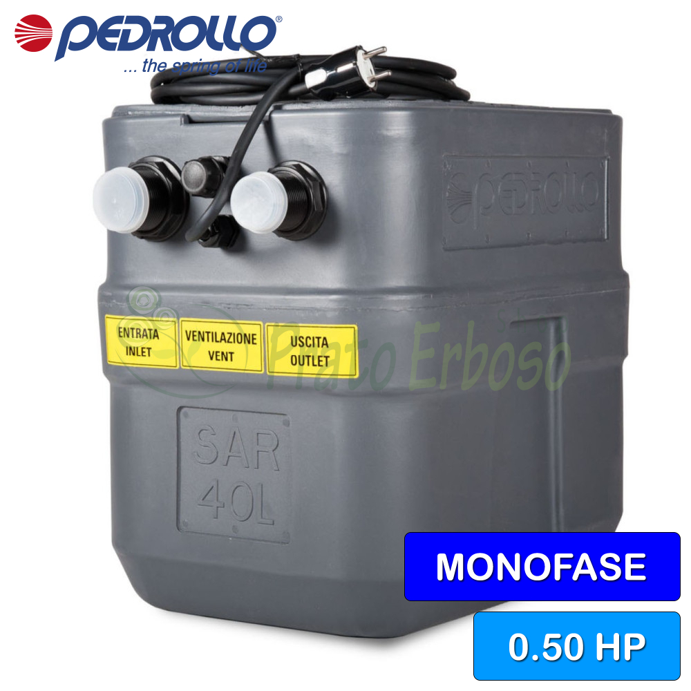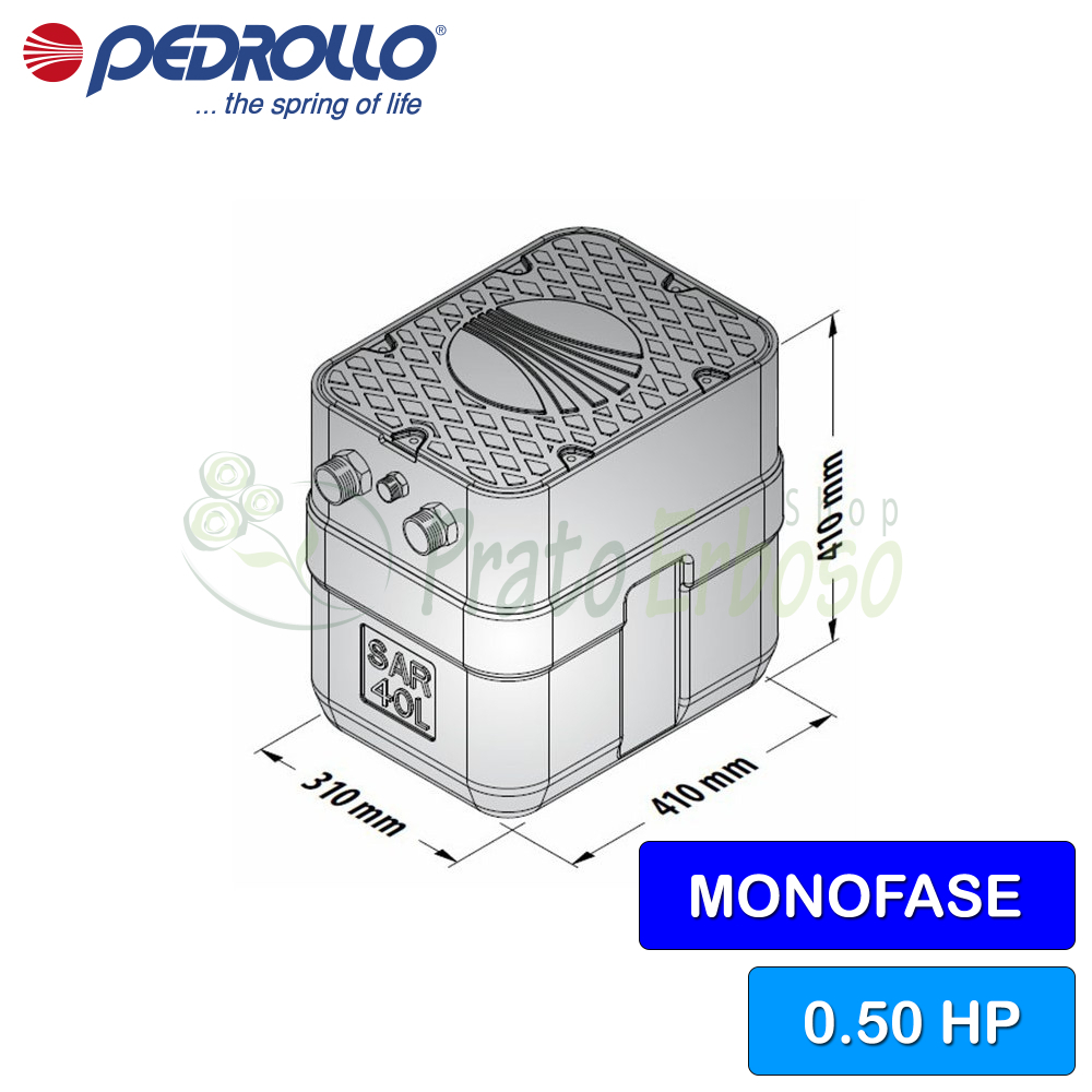 Rezervor de 40 de litri. Pompă Pedrollo TEX 2. Debit de refulare de până la 200 l/min (12 m³/h). Înălțime de pompare de până la 7,5 m. Motor de 0,37 kW (0,50 CP).