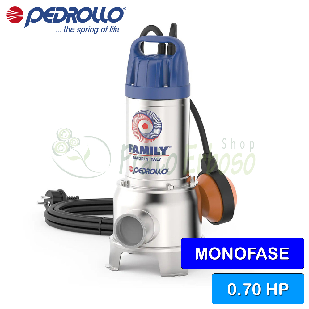 Modelul FAMILY este echipat cu un cablu de alimentare de 5 metri, un întrerupător cu flotor și un suport pentru furtun.