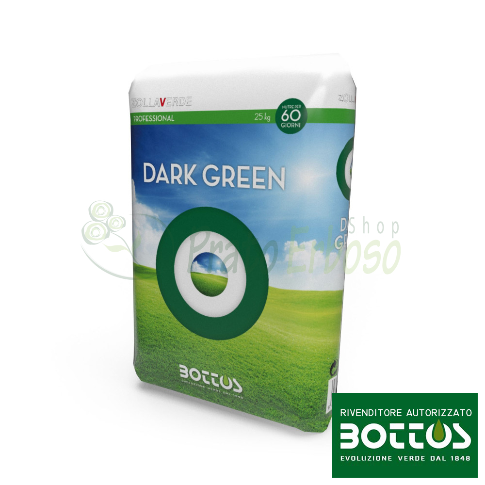 Dark Green nga Bottos është një pleh azotik dhe gjelbërues për terrenin (NPK 11.0.0 + 3 MgO + 4.5 Fe) i përshtatshëm për çdo periudhë të vitit. Format e tij azotike me veprim të shpejtë përbëhen nga amoniak dhe ure N, duke siguruar elemente ushqimi dhe rritjeje për lëndinë. Efekti i tij i ngjyrave në terren është i menjëhershëm dhe i qëndrueshëm falë pranisë së magnezit dhe hekurit.