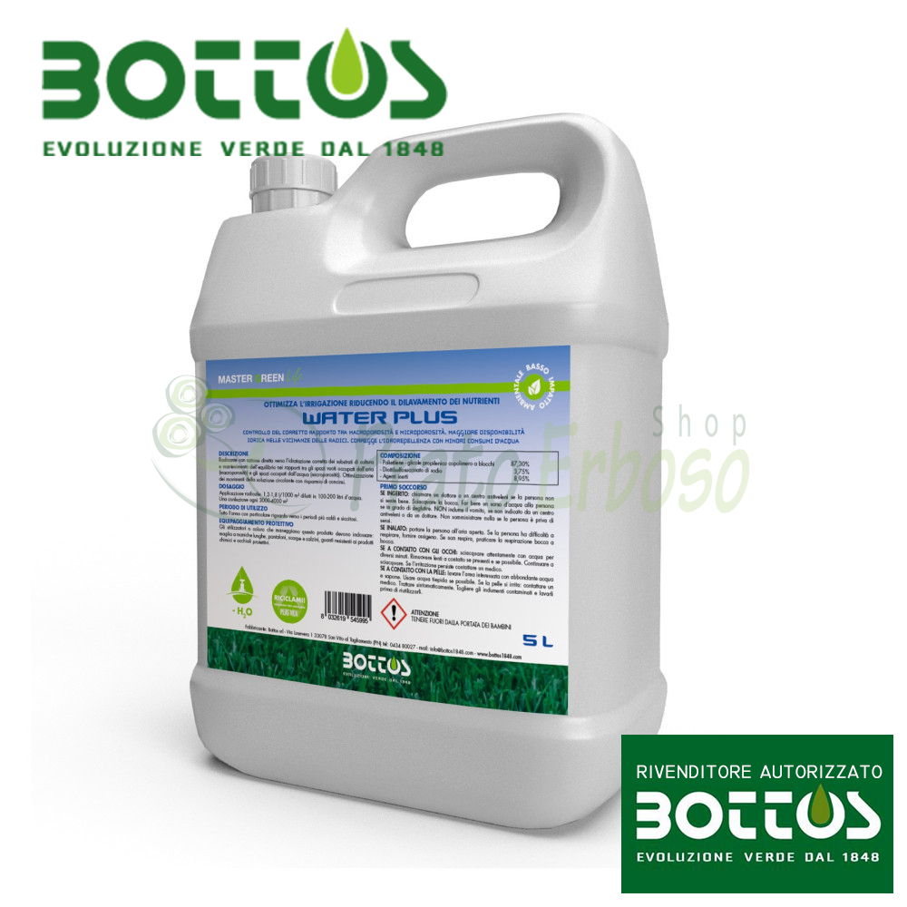 Water Plus nga Bottos është një agjent surfaktant i gjeneratës së fundit që përdoret për të luftuar tokat e papërshkueshme nga uji që krijojnë zverdhje për shkak të hidrofobisë dhe pikave të thata.